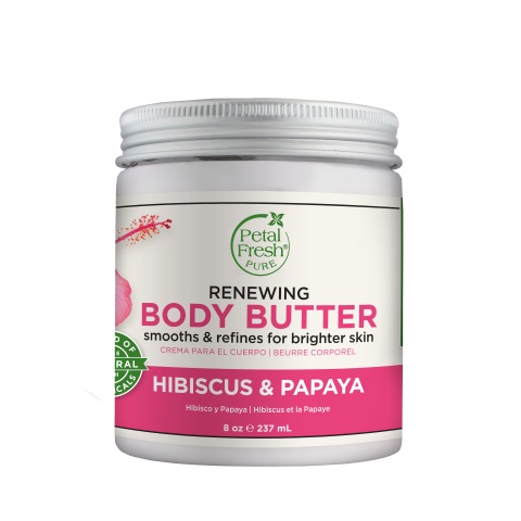 Petal Fresh® Pure Body Butter Hibiscus & Papaya hydrateert en vernieuwt de huid. Gecertificeerde biologische hibiscus en papaja scrubben de huid zachtjes, vermeerderen de huidcellen en geven een egale teint aan een vernieuwde huid. Deze rijke, romige formule is versterkt met kokosoliecomplex – een exotische mix van gecertificeerde biologische kokosolie, arganolie en sheabutter-extract zodat de huid zijdezacht aanvoelt.