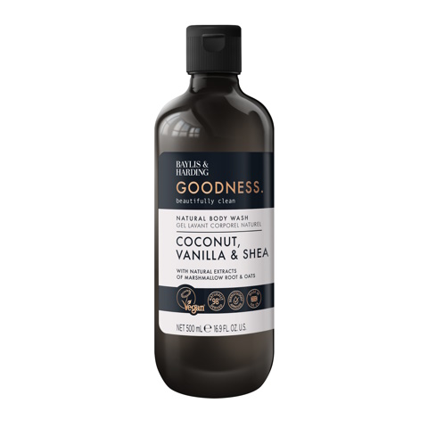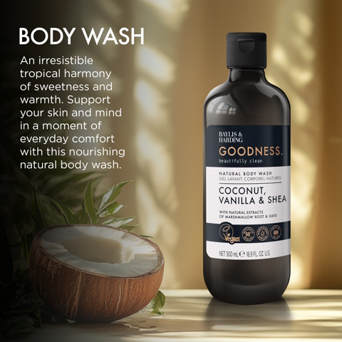 Baylis & Harding Goodness Body Wash Coconut, Vanilla & Shea is een douchegel met de zoete en romige geur van kokos, vanille en shea. De verzachtende extracten van heemstwortel en haver hebben een reinigende en kalmerende werking. Maak van het douchen een moment om van te genieten!