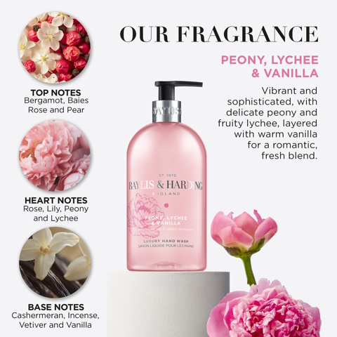 Baylis & Harding Hand Wash Luxury – Peony, Luchee & Vanilla is een verfijnde handzeep doordrenkt met de geur van delicate pioenroos, een vleugje frisse lychee en warme vanille. Deze luxe handzeep bevat natuurlijke oliën en toegevoegde hydraterende ingrediënten. Verwen de handen met deze zachte romantische geur!