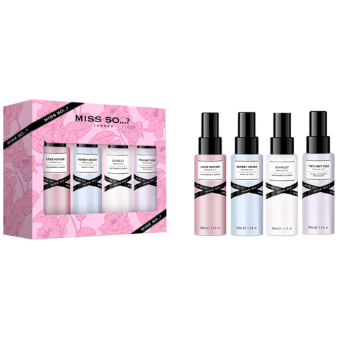 Miss So…? Mini set bevat vier mini parfum mists met de geuren Love Potion, Secret Crush, Starlet en Twilight Kiss. Een ideale set om regelmatig van geur te wisselen. Omarm het verlangen, geniet van de romantiek en word verliefd op deze betoverende geuren.