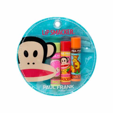 Paul Frank is de laatste jaren niet meer uit het straatbeeld weg te denken en nu is er ook een serie lip smackers met verschillende Paul Frank smaakjes. De felt bag is een leuk tasje met hierin drie originele smaakjes lip smacker, waaraan de Paul Frank-figuren hun eigen touch hebben gegeven. Julius: Strawberry Banana, Spicoli: Spumoni (Italiaanse ijssmaak), Worry Bear: Honey Sweet.