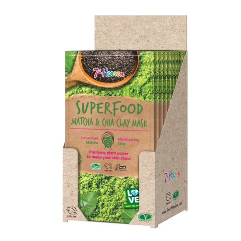 7Th Heaven Superfood Matcha & Chia Clay Mask is een reinigend gezichtsmasker. Matcha en Chia zorgen voor bescherming en hydratatie. De huid zal weer fris aanvoelen